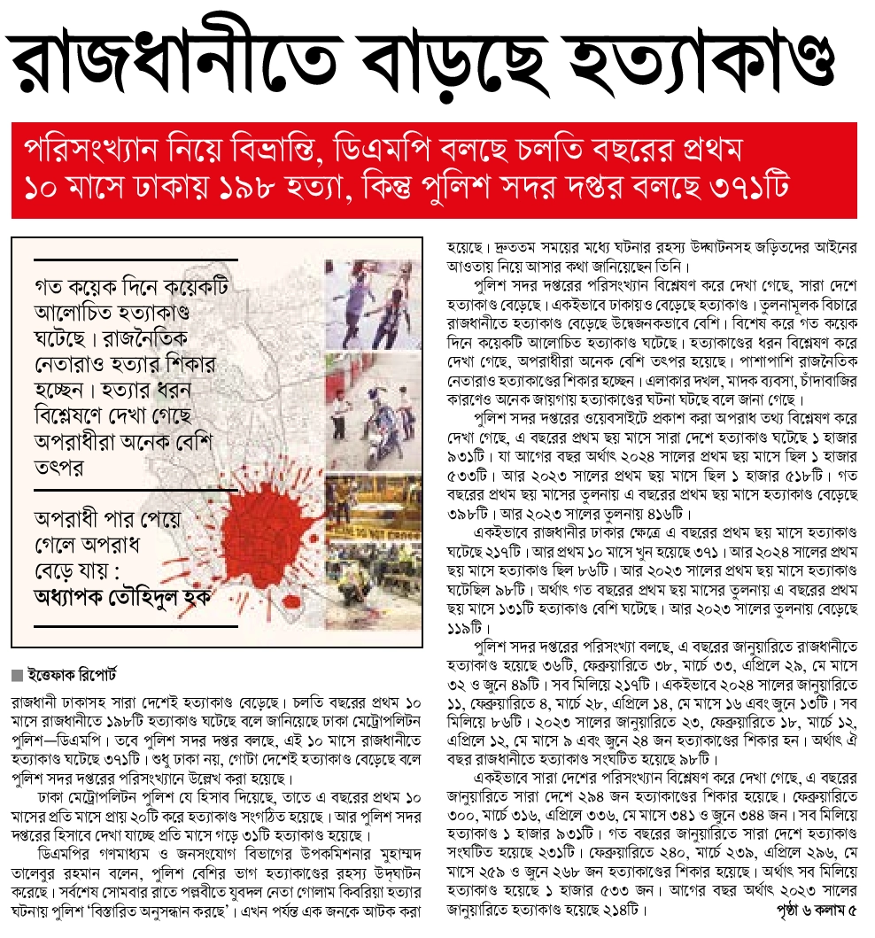 রাজধানীতে বাড়ছে হত্যাকাণ্ড - দৈনিক ইত্তেফাকের প্রধান সংবাদ এটি।