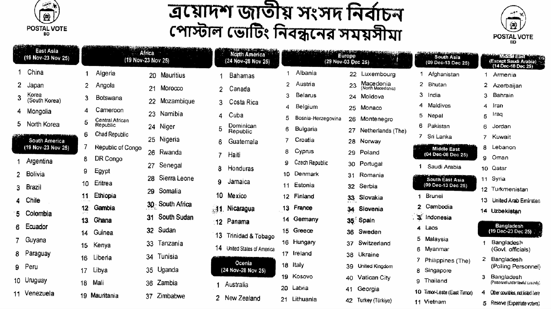 সংযুক্তি-১ এর তথ্যানুযায়ী, পূর্ব এশিয়া, দক্ষিণ আমেরিকা ও আফ্রিকার দেশগুলোর প্রবাসীরা ১৯-২৩ নভেম্বর, উত্তর আমেরিকা এবং ওশেনিয়া অঞ্চলের জন্য ২৪-২৮ নভেম্বর, ইউরোপের দেশগুলোতে থাকা প্রবাসীরা ২৯ নভেম্বর থেকে ৩ ডিসেম্বর, মধ্যপ্রাচ্যের সৌদি আরবের প্রবাসী ভোটাররা ৪ থেকে ৮ ডিসেম্বর, দক্ষিণ-পূর্ব এশিয়া এবং দক্ষিণ এশিয়ার দেশগুলোর প্রবাসীরা ৯ থেকে ১৩ ডিসেম্বর, মধ্যপ্রাচ্যের দেশগুলোতে (সৌদি আরব ছাড়া) থাকা প্রবাসীদের ১৪-১৮ ডিসেম্বরের মধ্যে নিবন্ধন প্রক্রিয়া সম্পন্ন করতে হবে।