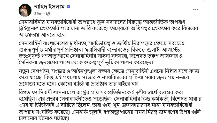 নাহিদ ফেসবুক পোস্টে লিখেছেন, সেনাবাহিনীর মানবতাবিরোধী অপরাধে যুক্ত সদস্যদের বিরুদ্ধে আন্তর্জাতিক অপরাধ ট্রাইব্যুনাল গ্রেফতারি পরোয়ানা জারি করেছে। তাদেরকে অতিসত্বর গ্রেফতার করে বিচারের আওতায় আনতে হবে।