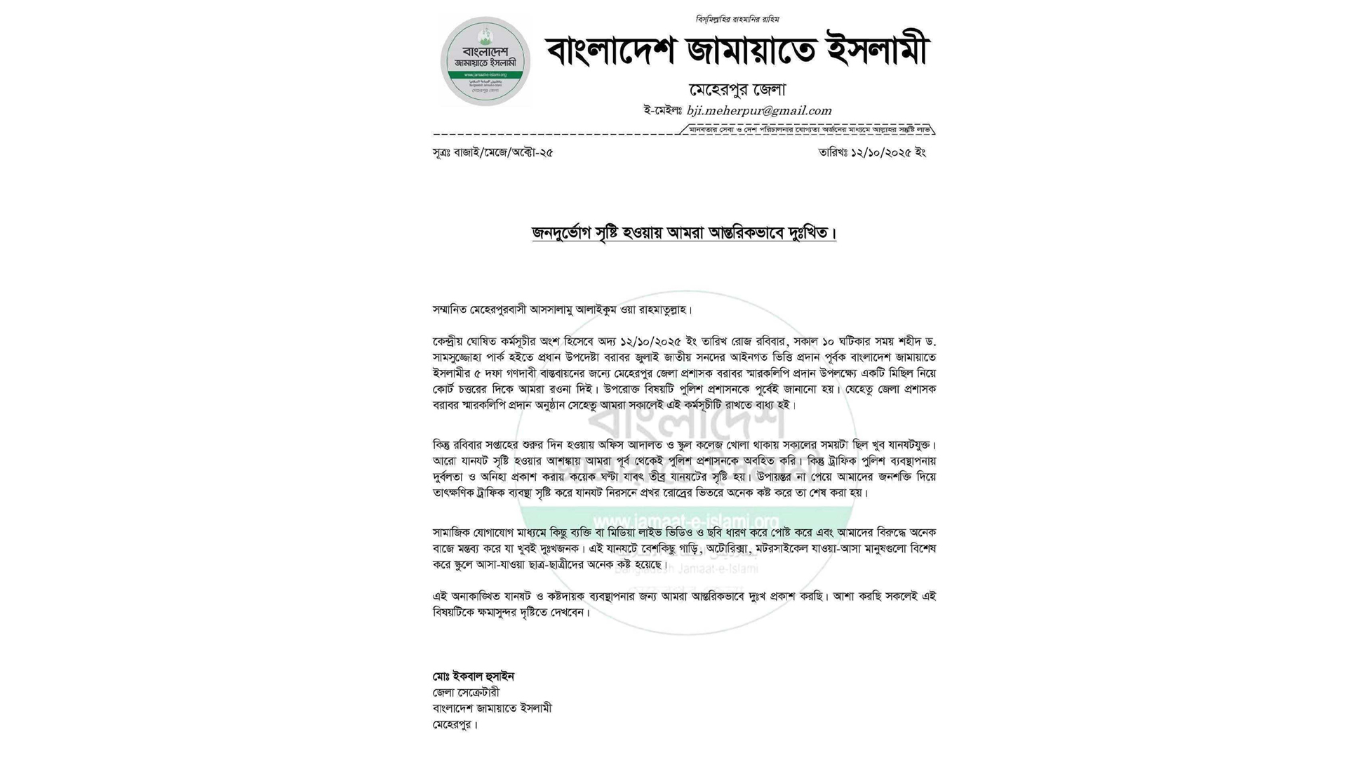 প্রেস বিজ্ঞপ্তিতে বলা হয়েছে, কেন্দ্রীয় ঘোষিত কর্মসূচির অংশ হিসেবে জামায়াতে ইসলামী মেহেরপুর শাখা শামসুজ্জোহা পার্ক থেকে সকাল ১০টার সময় জেলা প্রশাসকের কার্যালয় পর্যন্ত মিছিল নিয়ে যায়। এবং জেলা প্রশাসকের কার্যালয়ের সামনে সংক্ষিপ্ত সমাবেশ শেষে জেলা প্রশাসকের কাছে স্মারকলিপি প্রদান করা হয়। কর্মসূচি পালনের ফলে সড়কে যানজটের সৃষ্টি হয়। রোববার সাপ্তাহিক ছুটির শেষে প্রথম কর্ম দিবসের কারণে সড়কে কর্মমুখী মানুষ, শিক্ষার্থী, অফিস-আদালতের কর্মজীবীদের ভোগান্তি হয়। মানুষের স্বাভাবিক জীবনযাত্রায় এই বাধা সৃষ্টি হওয়ায় দুঃখ প্রকাশ করেছে জামায়াতে ইসলামী মেহেরপুর শাখা।